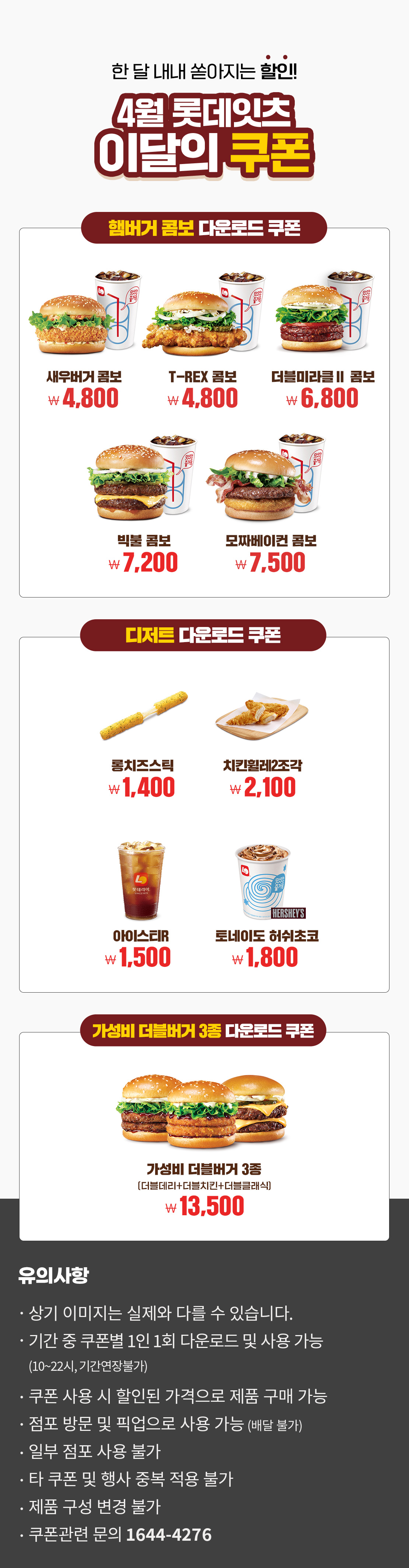 이 프로모션은 4월 한 달 동안 매장에서만 제공되며, 고객들은 할인된 가격으로 롯데리아의 인기 메뉴를 즐길 수 있었습니다.